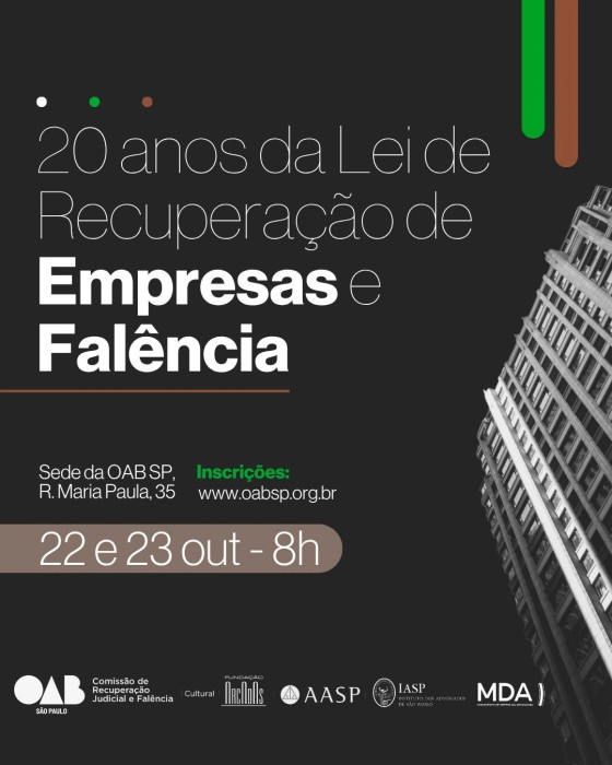 Nos dias 22 e 23 de outubro, a OAB São Paulo realizará um evento em celebração às duas décadas da Lei nº 11.101/2005, marco fundamental na consolidação do sistema de recuperação judicial e falência no Brasil.